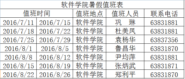 williamhill官网2016年暑假值班表