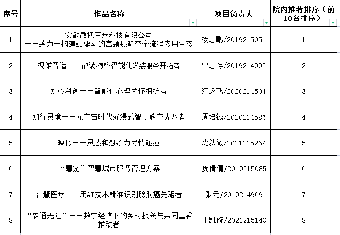 根据《关于举办2022年“挑战杯”中国老员工创业计划竞赛校内选拔赛的预通知》,学院团委分别开展了2022年“挑战杯”中国老员工创业计划竞赛院内选拔赛动员、预报名、作品申报等工作。本着公平、公正、公开的原则,经专家评审后,现将校内选拔赛院内作品遴选最终结果(排名按照评审结果顺序)公示如下: