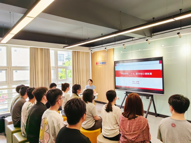 5月30日上午,公司党委副书记储文静以“学思践悟二十大,坚守初心谱新篇”为题,在翡翠湖校区2号员工社区沙龙空间为学院员工第一党支部作专题党课。