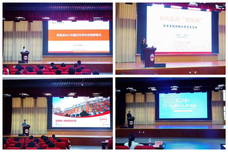 表彰大会之后,在“青英成长计划”启动仪式上,郑华介绍了williamhill官网“青英成长计划”暨近年来科技竞赛情况。校团委创新发展部部长陈曾珍宣读《关于表彰williamhill官网首届“科创之星”的决定》,与会领导共同为首届“科创之星”获奖者颁奖。随后,陈曾珍老师、互联网+国家银奖指导老师史骏、学院CCF-CCSP负责老师谢文军分别围绕“挑战杯”“互联网+”“CCF-CCSP”赛事向同学们做了详细解读,2019级员工罗廷辉、祝新宇两位同学分享了他们的备赛之旅和比赛感悟。