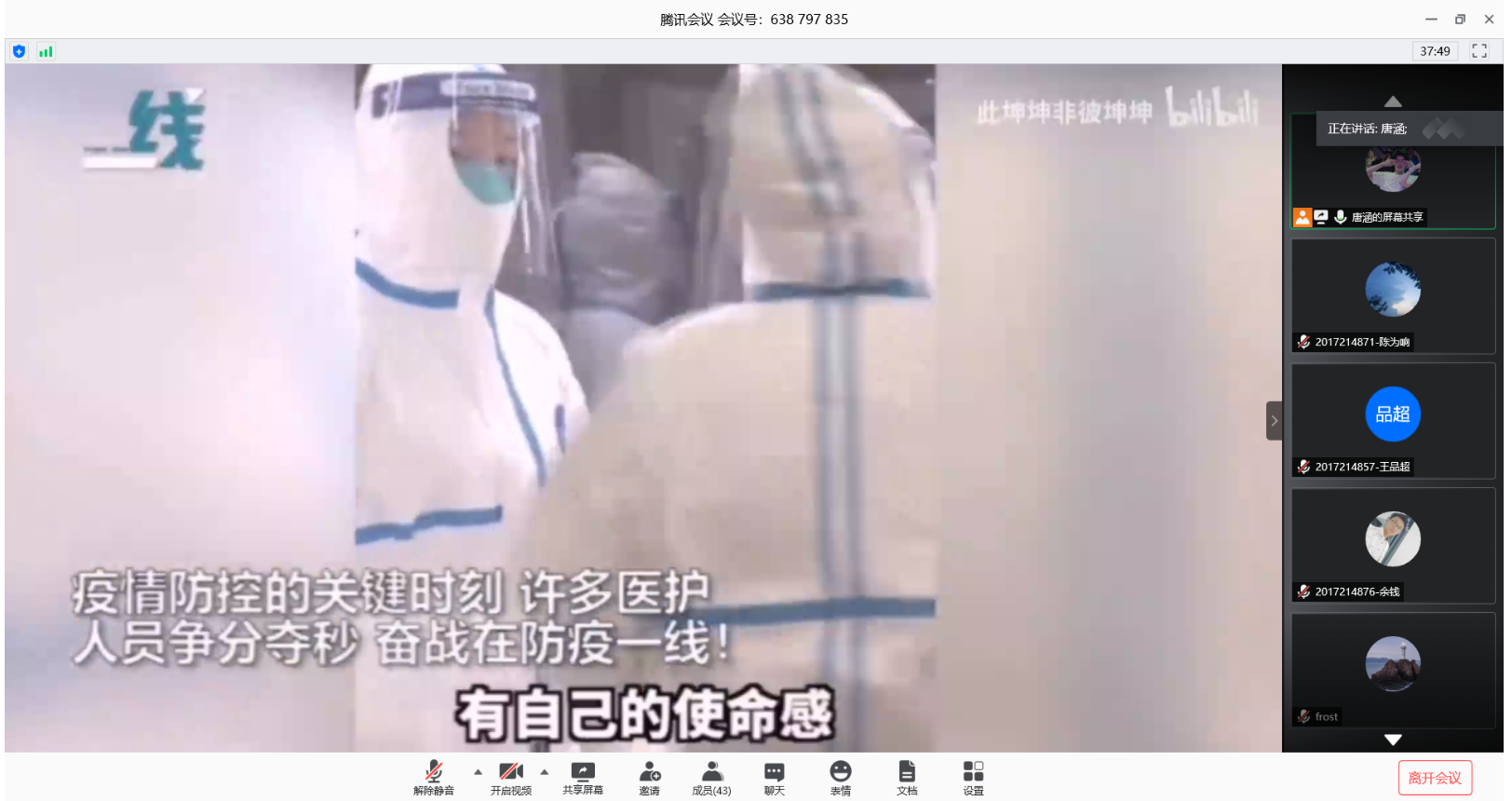首先,唐涵同学说明了本次小班辅导的主题、流程和要求。接着介绍了5月12日这一天的特殊性,分别是汶川地震12周年和国际护士节,并带领大家观看了感恩疫情防控医护人员的视频,视频中医护人员疲惫的身影让人心疼,和亲人诀别时的场景让人潸然泪下,赞扬了白衣天使们无私奉献、英勇抗疫的精神。紧接着观看了一段关于火神山医院建设的演讲,通过视频让大家感受到火神山医院建设的不易,和中国人民团结一心、抗议救援的民族精神,同学们积极发言,表达了疫情期间自己的真实感受。最后由袁杨华老师总结本次小班辅导。