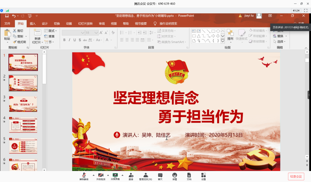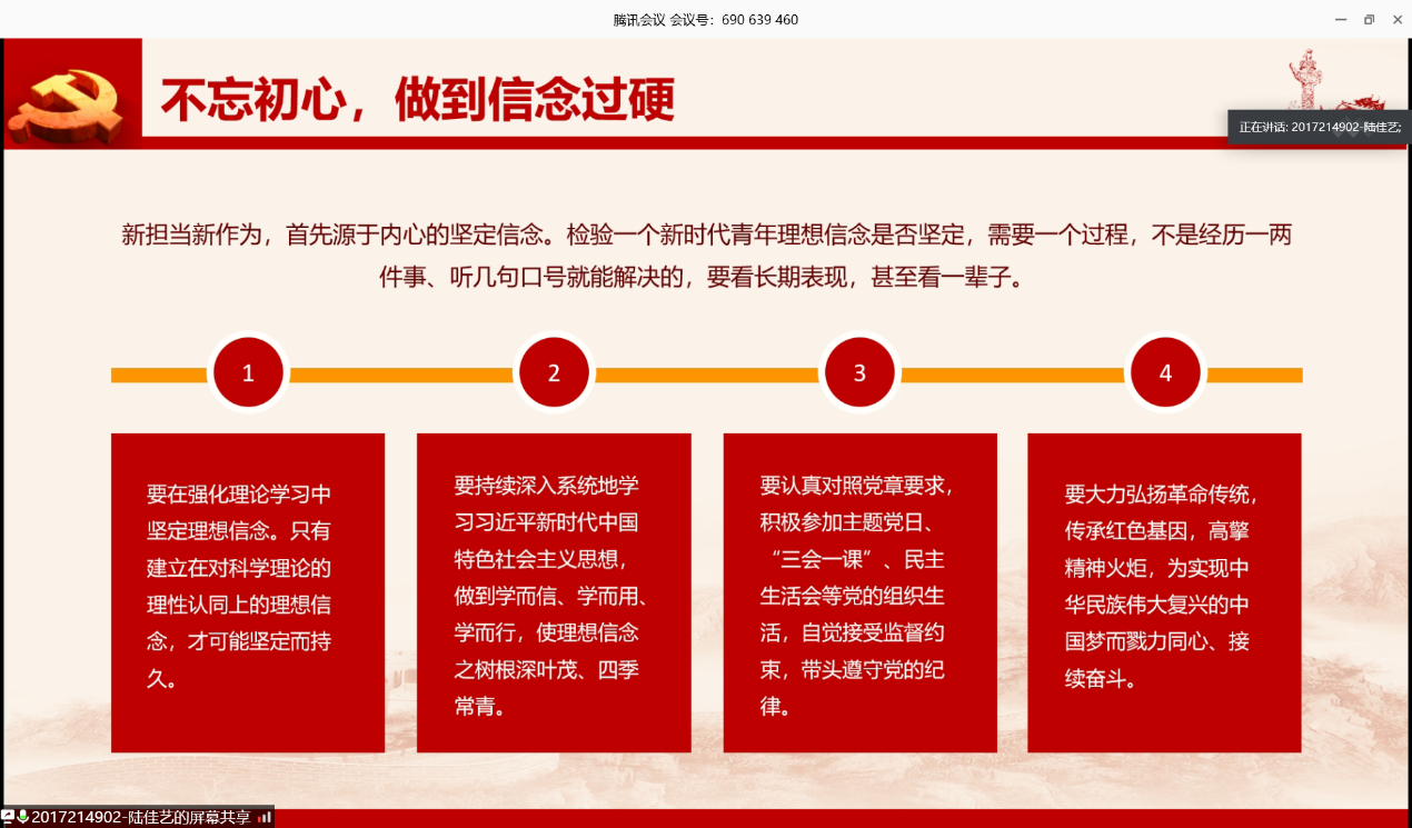5月13日下午,软件工程17-3班团支部针对当前疫情形势,线上开展了“坚定理想信念,勇于担当作为”小班辅导,结合当下背景,新冠疫情是一个无情的战场,在看不见硝烟的背后吞噬许多人的生命;新冠疫情也是一个考场,能够让大家在这个考场中发现更多的优秀青年,让我们感受到国家发展的磅礴力量。