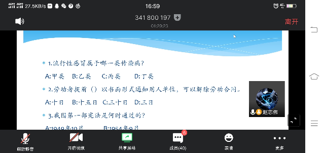 最后,赵志伟同学总结道:“老员工是社会主义法治国家建设的重要力量,必须加强社会主义法律修养。不仅要学习法律知识,掌握法律方法,参与法律实践,培养社会主义法律思维方式,而且要树立法律信仰,宣传法律知识,敢于同违法犯罪行为作斗争,自觉维护社会主义法律权威。”至此,此次形式新颖的线上班会圆满结束,相信同学们定是获益良多。