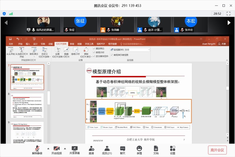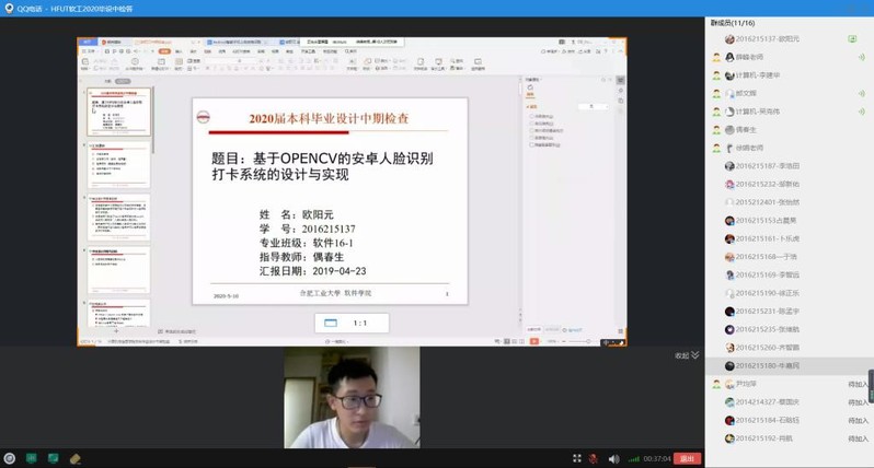 本次中期检查答辩共分成九组,每组分别建有答辩QQ群,并设有教师和员工的答辩组长,便于员工和老师的联系和答辩通知安排等。此次线上答辩采用腾讯会议或QQ视频电话直播平台,利用屏幕共享,每个员工按照事先规定的顺序依次进行线上PPT展示,主要从目前已完成的工作、程序演示、遇到的问题与下一步的计划和翻译内容等方面进行汇报。然后答辩评委老师针对员工汇报的内容进行提问。答辩结束后,每组答辩委员会根据员工的答辩表现和问题回答情况综合给出中期检查成绩。整个答辩过程要求员工打开摄像头,更好地增加师生间的互动,所有小组的中期检查答辩顺利地完成。