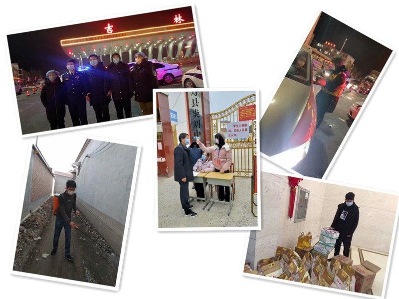 19级的辅导员朱子琪老师在安徽寿县的一所中学门口主动担任站岗测温、提供防控指引志愿服务工作;19级4班张恭溥同学得知自己母亲所在的医院缺乏志愿者,主动要求每天晚上前往吉林市船营区的高速路口为每一辆反吉的外省车辆车内人员测量体温,做好相关登记工作,得到当地卫生局领导的高度评价;19级3班王子逸同学在浙江温州疫情最严峻的时候,和父母一起作为社区志愿者为每家每户运送配发的物资;19级4班张志伟同学在山东省临清市吴刘庄自愿报名成为村口志愿值班人员(因为是晚上值班至12点,仅留存的一张照片太黑了,根本看不清),值班任务结束后又匆匆报名参与街道消毒喷洒工作,为家乡的防疫贡献自己的一份力量。