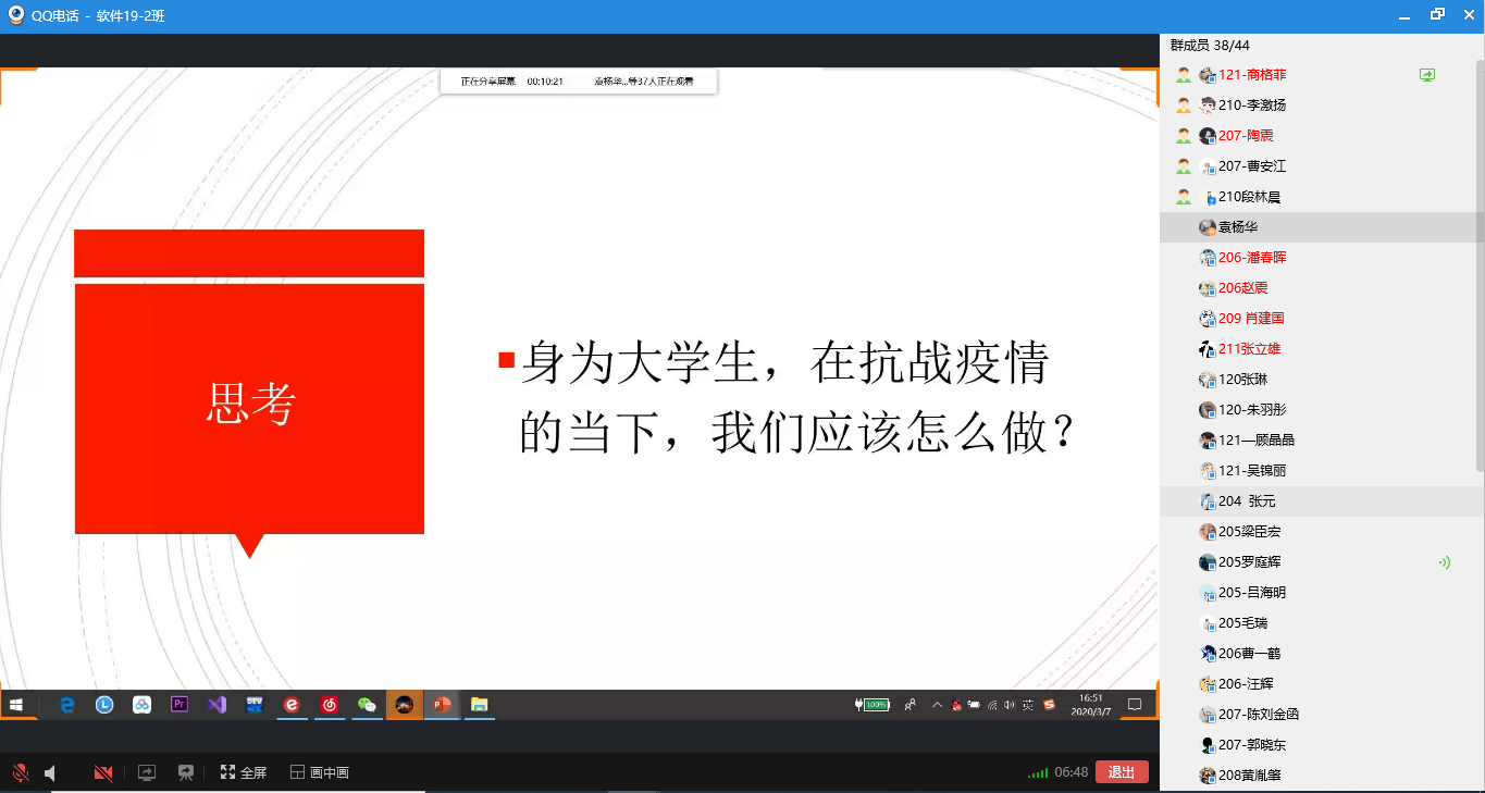 活动刚开始,团支书商格菲同学首先介绍了此次活动的目的并播放了两个视频,八十八位明星合唱抗疫歌曲《一起到黎明》,以及《明天会好的》,充分表现了社会人员对武汉人民的关心,对抗议工作的众志成城,对中国必将战胜疫情的信心与希望。视频一结束,也进入我们的主体活动-“身为老员工,在抗击疫情的当下,我们应该怎么做?”问题一拿出,便引起了同学们的积极响应,罗庭辉同学认为大部分的我们只要在家好好呆着,不聚众,做好自己所能做到的一些事情,就是对社会的一个贡献;之后,李激扬表达了不要轻信谣言,不能做谣言的传播者的观点;曹安江,张元以及李宏博等同学也都发出来自己的声音,表达了自己的观点。讨论结束后,袁老师针对支部团员的发言进行了补充,对同学们日常生活表示进行关心,希望大家在家也能保持良好的生活习惯、按时起床、按时上课,合理利用假期时间,为新学期做好准备。