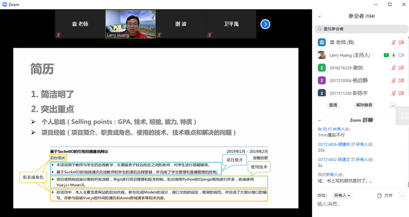 随着2021届实习季的临近,疫情期下员工面临的新问题和新挑战,williamhill官网于4月18日下午邀请了Zoom中国招聘经理黄健向准毕业生们开展求职准备线上指导讲座。讲座通过Zoom视频会议开展,学院2017级所有本科生参加。