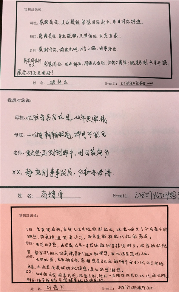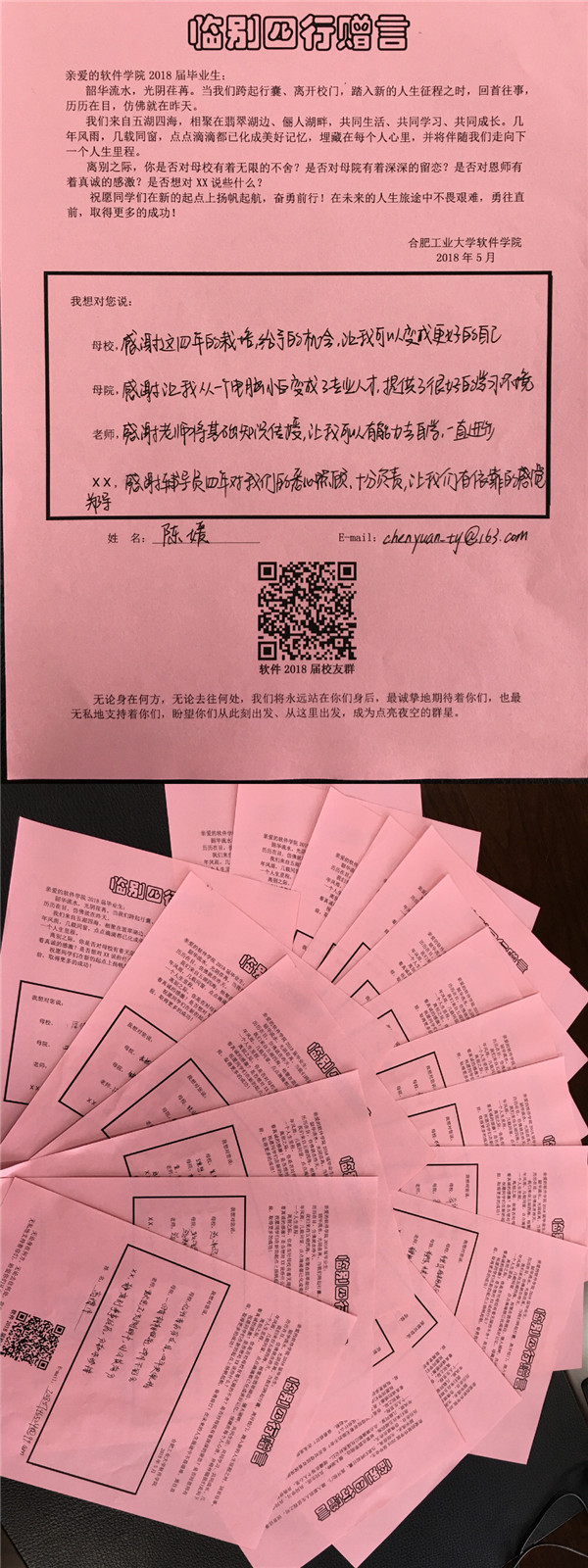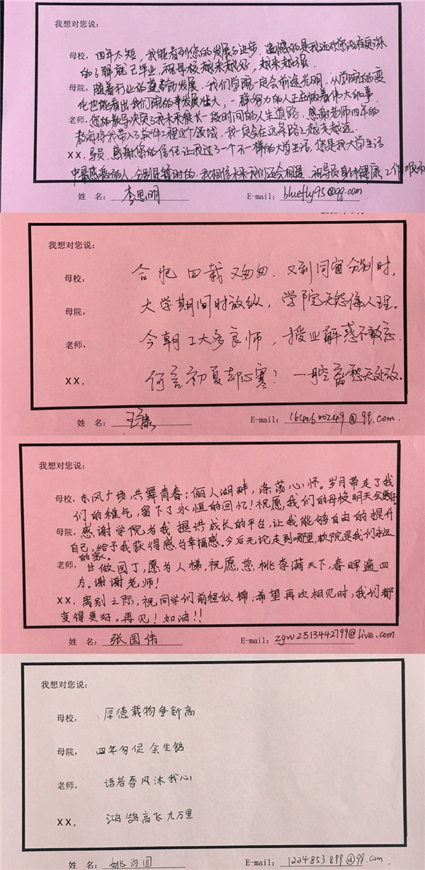 活动一经发起,共收集2018届全体毕业生82份满满的祝福:“‘厚德、笃学、崇实、尚新’铭记于心,为母校添彩”;“厚德载物争新高,四年匆促余生铭,语若春风暮我心,鸿鹄高飞九万里”;“ 合肥四载又匆匆,又到同窗分别时。大学期间时放纵,学院无怨诲人理。今朝工大多良师,授业解惑不敢忘。何言初夏却心寒,一腔离愁无处放。”;“ 母校,忆往昔历历在目,四年更深情;母院,一回首朝朝眼前,碎月不割舍;老师,默思念刻刻眸中,时日莫离分;同学,静离别事事经历,分秒亦珍惜。”“母校,感谢有您,生活精彩,梦想因您起飞,未来因您辉煌。母院,感谢有您,身边温暖,天涯何处,永是吾家。老师,感谢有您,前途光明,片言之赐,皆事师也。所有同学,感谢有你们,四年相伴。相逢又告别,归帆又离岸;既是告别,也是开端。愿你们未来更好!”……