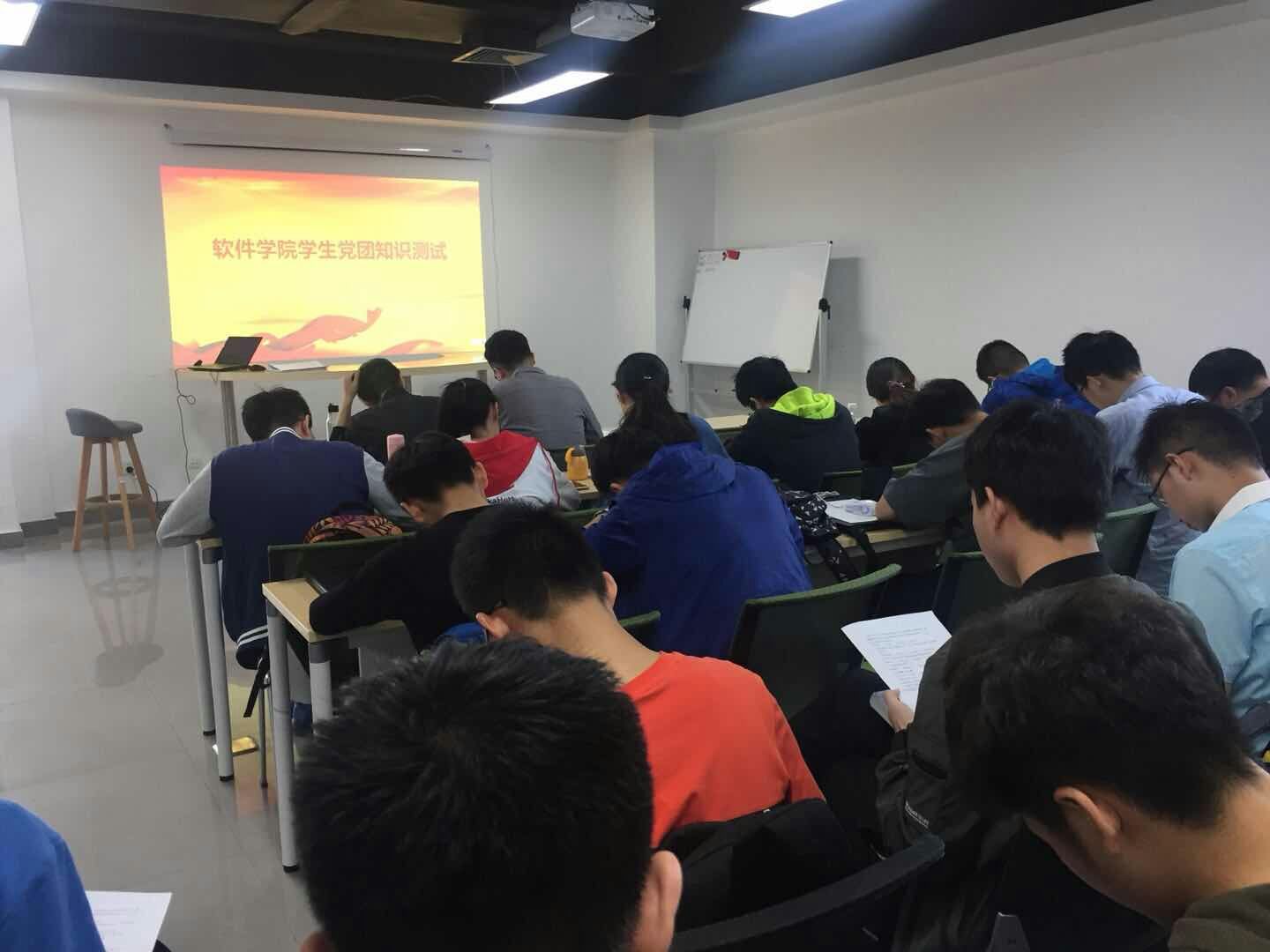 测试采取闭卷形式,试卷共有单选、多选和简答三种题型,内容涵盖了习近平新时代中国特色社会主义思想、党的十九大精神、两会、党章党规、团建,基本国情和时事热点等。考场内,大家严肃认真、独立思考,用心做答。