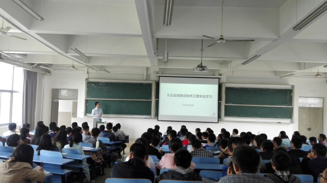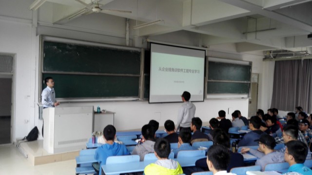 郭经理首先对公司软件工程专业独特的“3+1”培养模式作出了肯定,表示很多企业喜欢这样有着一年实习经验的优秀毕业生,并以一句“你们正迎来一个最好的时代”充分肯定了软件工程专业的广阔前景。随后,郭经理通过对“机器人大战围棋大师”和“京都快递”的介绍,引出“两化融合”的概念,指出信息化已遍布各行各业,行业前景可观,提升了大家对于专业的敏感性和自信度。最后,他重点讲解了企业在招聘人才时的一系列措施,说明软件工程专业就业的几大方向:“软件开发”,“软件测试”,“技术支持与维护”,“产品推广,互联网运营推广”等,同时突出强调了企业优秀员工应具备的品质。