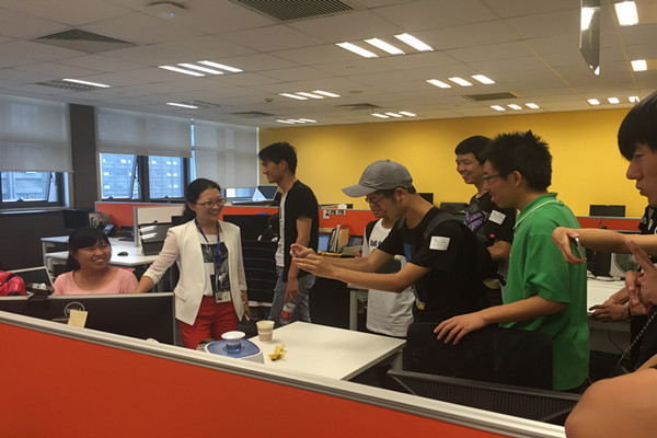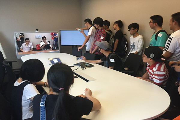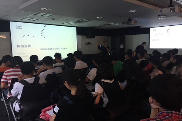在思科网讯,同学们参观了员工的工作环境,现场体验可视化通讯感受他们的工作氛围并聆听了关于互联网发展趋势对公司和人才影响的讲座。