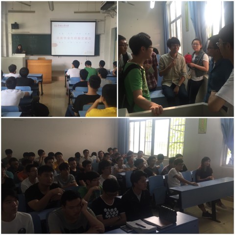 5月25日下午,williamhill官网在翡翠湖校区6教105、106教室举办优秀毕业生经验交流会。共邀请保研、考研、就业、出国等方面的14名优秀代表为低年级分享他们的经验,让在校生对当前的老员工活有一个明确的目标,解除在校生在就业、考研等方面的困惑,同时让他们感受压力,激励他们努力奋斗,做好自己的未来规划。本次交流座谈会由辅导员郑华老师主持。