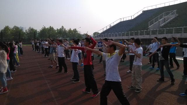 刚开始训练大家积极性很高,人到的比较齐,但后面有些同学开始稍微有些放松。于是,班委及时调整策略,分班训练,充分发挥八个班委作用。每个班委带领两个寝室分块进行训练,从中每个班委可以更好的进行监督和纠正动作。经过训练,大家把前几式的动作有不错的训练效果,而且训练态度改善很多,基本都听从所负责班委指令。
