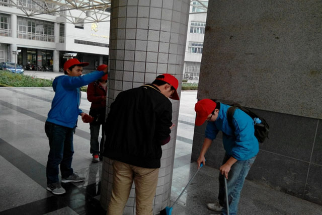 williamhill官网“微爱社”的同学们从图书馆会议厅外的墙壁开始清除,先用水打湿墙面,然后用尽各种方法清洁墙面。本以为会很轻松的活动,但做起来发现没那么简单。有的小广告比较新,用手撕下来就好,有的小广告用水打湿之后用抹布也能清理掉,可是小广告掉下之后残留下的痕迹和胶水就比较难弄了,大家必须用钢丝球反复的擦、蹭才能清理干净,更有最难处理的就是那种塑料材料的海报,我们必须用小刀一点一点的刮才行。经过一下午的努力,图书馆周围的小广告基本消失了,墙面也干净了。
