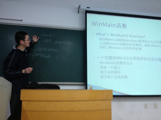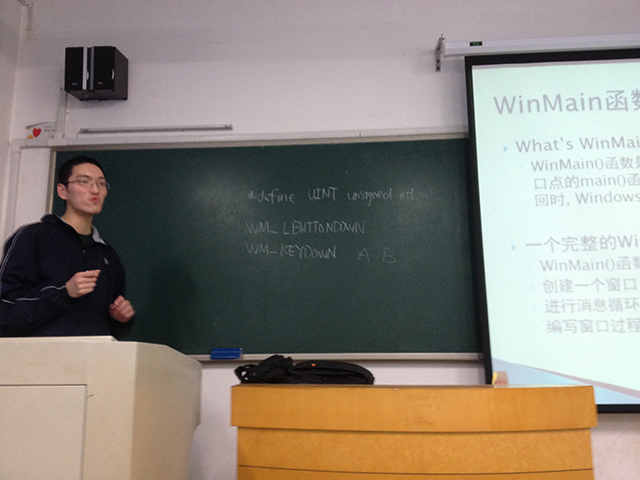 williamhill官网科协本学期第四次培训于周六在六教208展开。这次的培训应大家的意愿,是由技术部部长谢浩哲为大家讲解MFC的一些基本知识。谢部长这次从基础的角度对通过使用MFC创建一个窗口做了详细的讲解,包括创建一个窗口的步骤,以及有关于窗口的一些参数,并结合实例进行介绍,以便于让同学们对这些知识有一个更好的理解。最后谢部长又现场演示,编写了一个显示一个可调节大小的窗口,最后又给同学们布置了任务:用MFC编写程序。